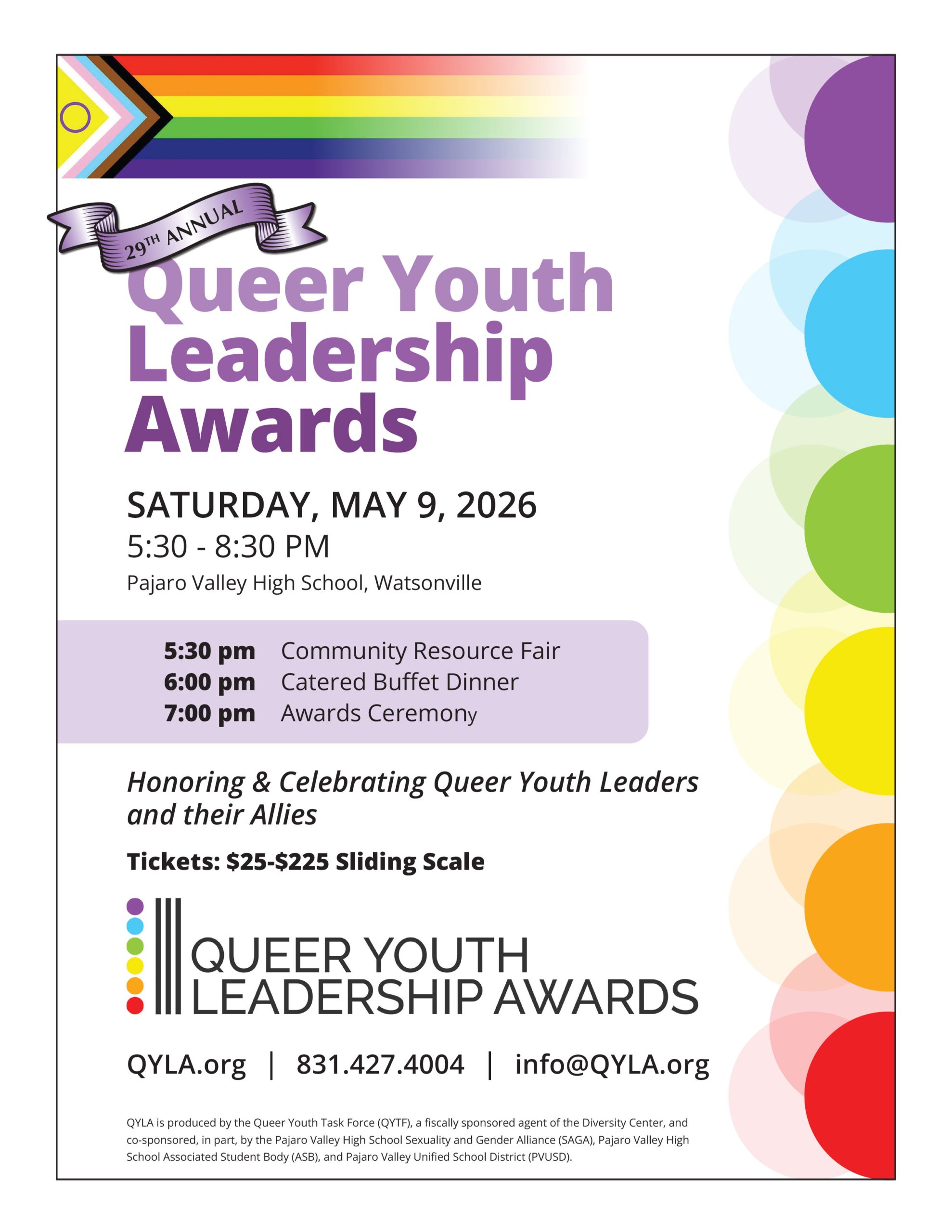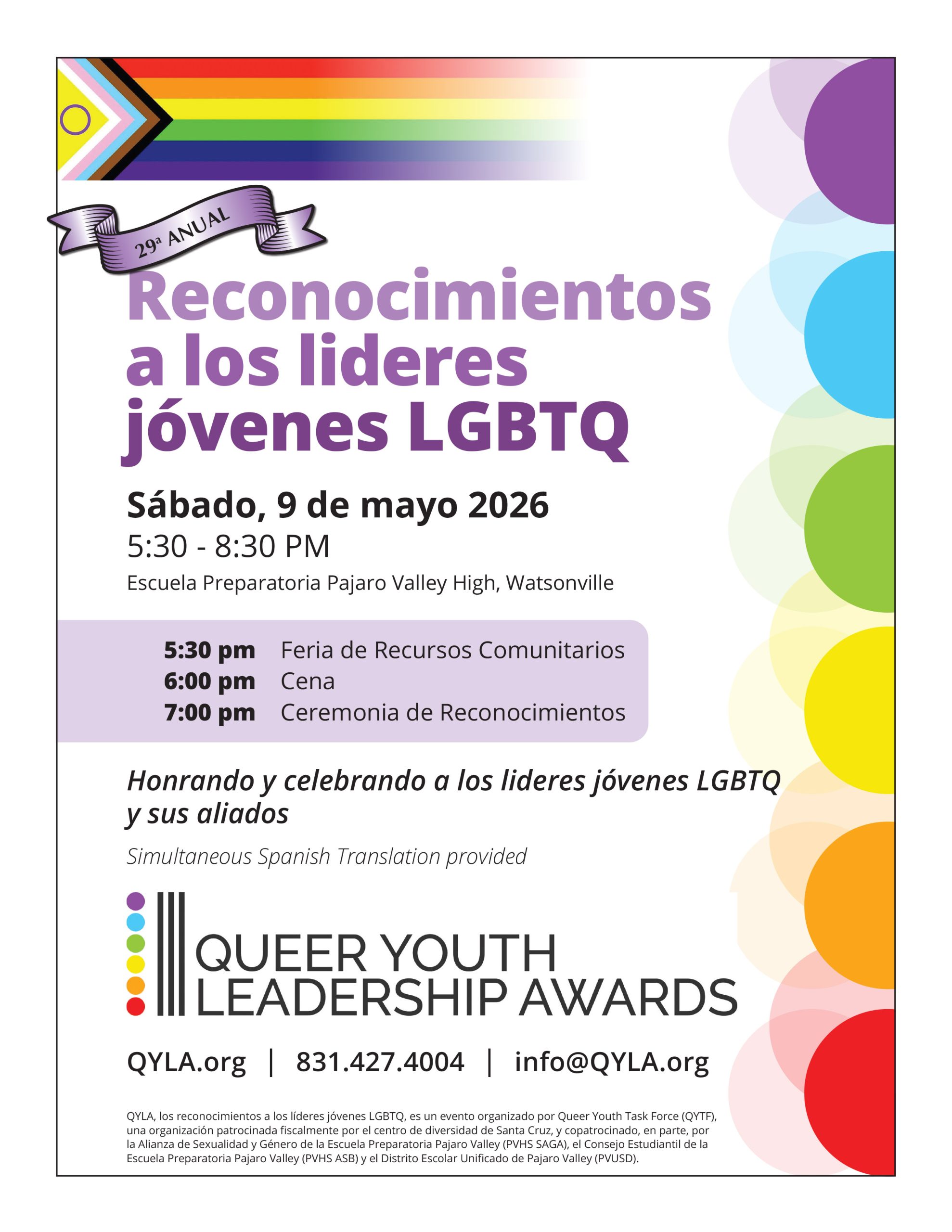 Join us for the 29th Annual Queer Youth Leadership Awards as we honor LGBTQIA2S+ students and their allies throughout the county! We can’t wait to host you for a night of celebration and fun indoors at Soquel High School. Come early for the resource fair at 5:30pm, then enjoy a delicious catered buffet dinner by D’La Colmena Catering at 6:00pm.