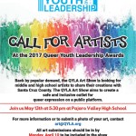 Back by popular demand, the QYLA Art Show is looking for middle and high school artists to share their creations with Santa Cruz County. The QYLA Art Show aims to create a safe and inclusive outlet for queer expression on a public platform. All art submissions should be in by Monday, April 10 to be included in the show. For more information or to submit a photo of your art, contact us at art@QYLA.org QYLA Art Show at the 2017 Queer Youth Leadership Awards on May 13th at 5:30pm at Pájaro Valley High School All art submissions should be in … [Read more...]