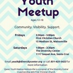 Watsonville Queer Youth Meet-up When: Fridays 3:30pm - 6pmWhere: First Christian Church in Watsonville Santa Cruz Queer Youth Meet-up When: Saturdays 1pm - 3:00pmWhere: Diversity Center in Santa Cruz Queer Youth Leadership Meet-Up When: Saturdays 3pm - 3:30pmWhere: Diversity Center in Santa Cruz For more information contact the LGBTQ Youth Program at (831) 425 - 5422 x104 or emailyouth@diversitycenter.org … [Read more...]