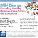 Ensuring Healthy Relationships Across the Spectrum Saturday, March 19th, 2016 9:30 am – 2:00 pm Scotts Valley High School, Scotts Valley All Middle School & High School LGBTIQ/Ally Students welcome! Meet students throughout Santa Cruz County — from Scotts Valley to Watsonville — who are working to help create safer schools in their community! Lunch and Snacks Provided Experience workshops put on by fellow youth and community resources. Meet LGBTIQ/Ally Community Leaders Fruit Smoothie Party and more Register now and … [Read more...]