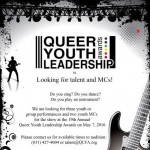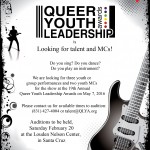 The 19th Annual Queer Youth Leadership Awards is looking for three youth or group performances and two youth MCs for the show taking place on May 7, 2016. Do you sing? Do you dance? Do you play an instrument? Please contact us for available times to audition: (831) 427-4004 or talent@QYLA.org When: Auditions to be held on Saturday, February 20th Where: Louden Nelson Center, Santa Cruz … [Read more...]