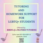 Are you looking for support for a one time project or ongoing support for classes that feel challenging? Birds of a Feather offers tutoring and academic support for LGBTQ+ and gender expansive elementary, middle, and high school students in a welcoming and affirming space. Reach out to set up individualized tutoring sessions in reading, writing, math, and study skills. Birds of a Feather offers sessions on a sliding scale, and with the support of a grant from The Community Foundation of Santa Cruz County, we can offer some sessions for … [Read more...]