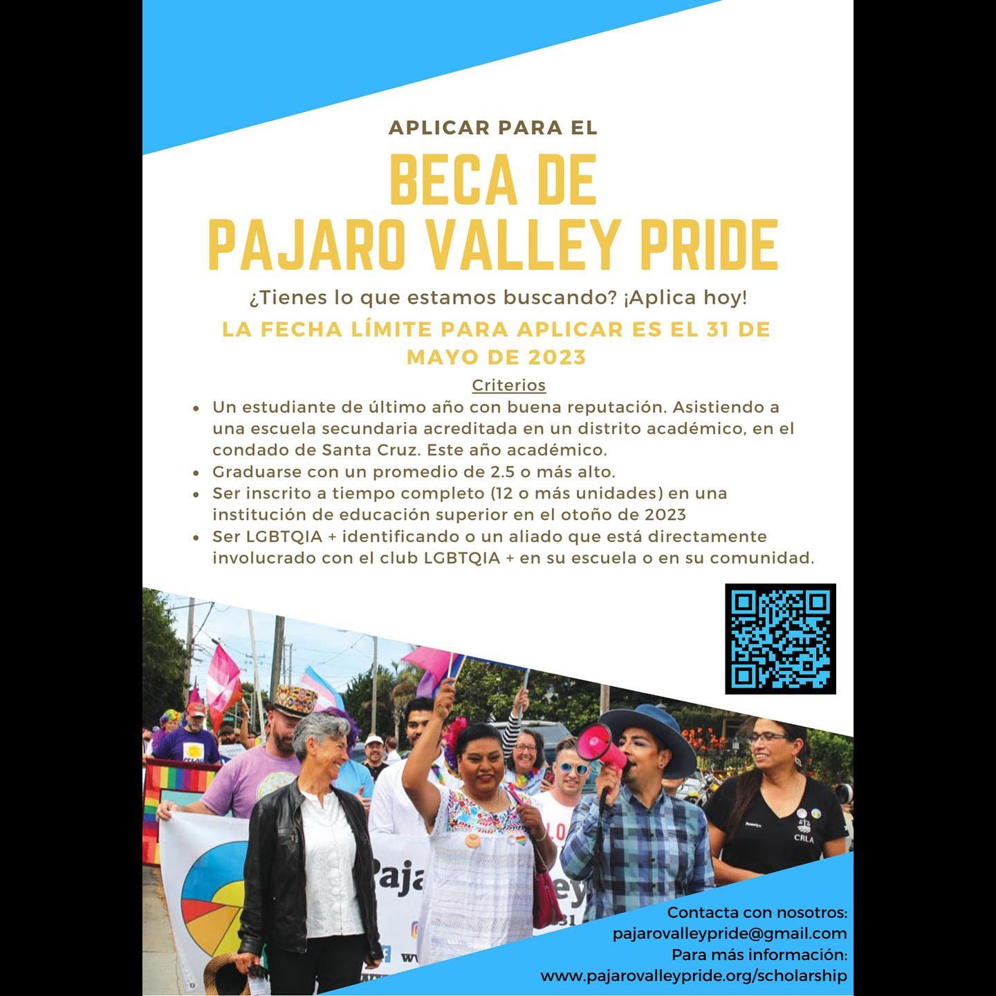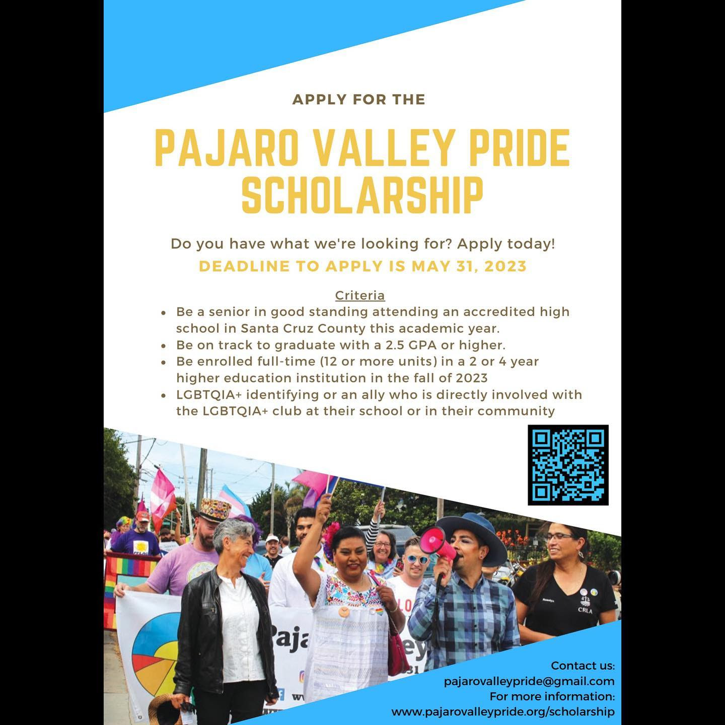 This year, Pajaro Valley Pride will award scholarships ranging from $500-$2000 (depending on availability) to students based on their academic successes as well as their involvement in social justice activism either on their school campus or in the community. Scholarships will be awarded regardless of citizenship.