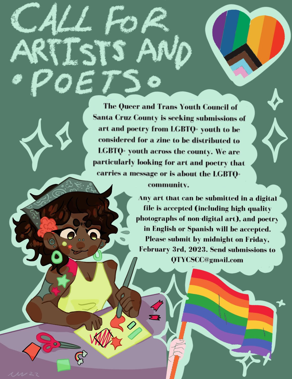 The Queer and Trans Youth Council of Santa Cruz County is seeking submissions of art and poetry from LGBTQ+ youth for a zine to be distributed to LGBTQ+ youth across the county. We are particularly looking for art and poetry that carries a message or is about the LGBTQ+ community. Any art that can be submitted in a digital file is accepted (including high quality photographs of non-digital art).