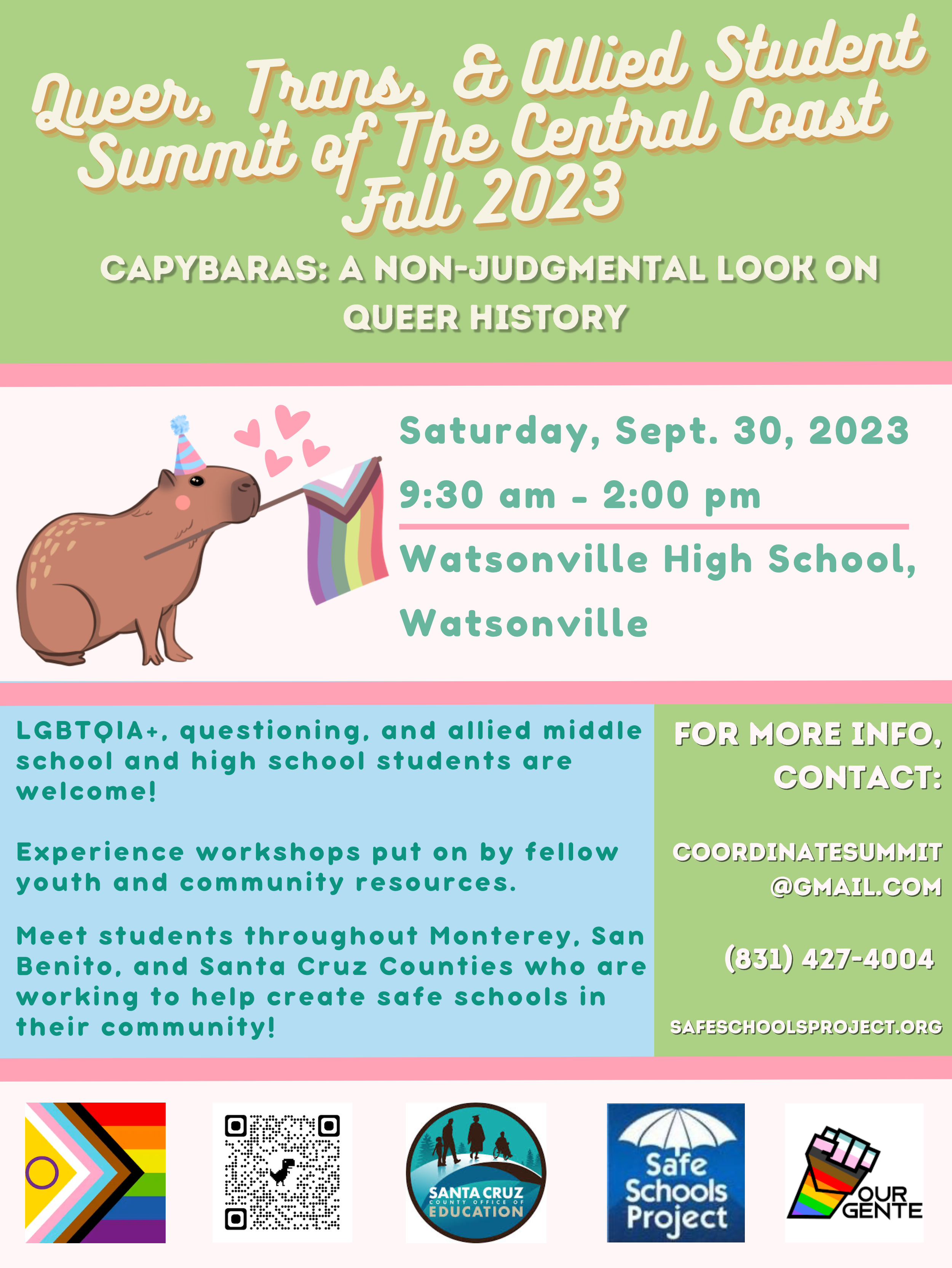 The Safe School Project Presents: A day of workshops, gatherings, and leadership opportunities for youth, families, and educators from the central coast! September 30, Watsonville