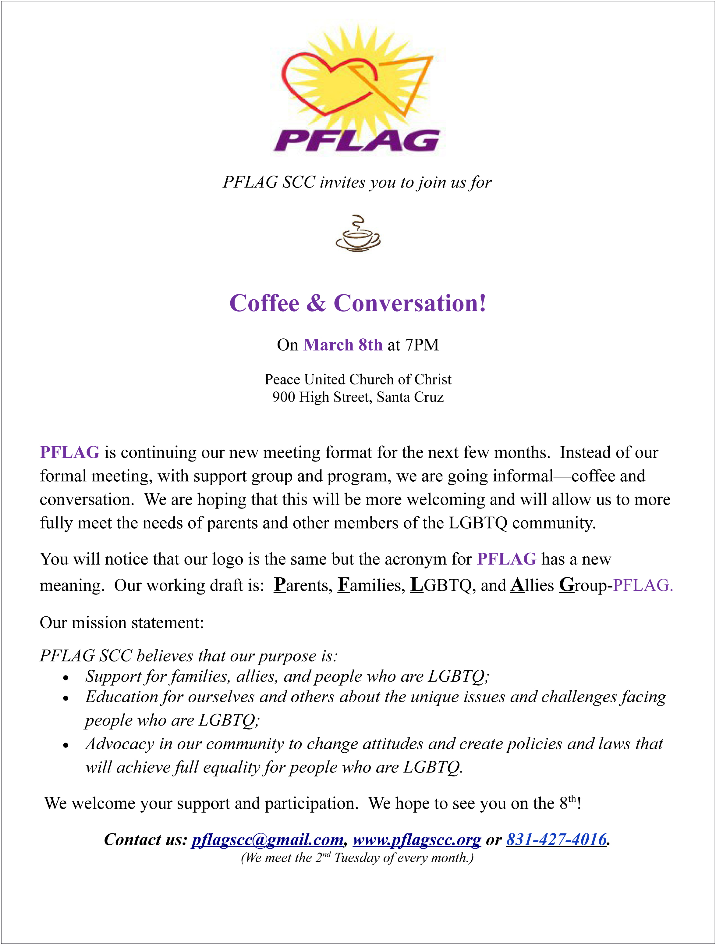 PFLAG is continuing our new meeting format for the next few months. Instead of our formal meeting, with support group and program, we are going informal—coffee and conversation. We are hoping that this will be more welcoming and will allow us to more fully meet the needs of parents and other members of the LGBTQ community.