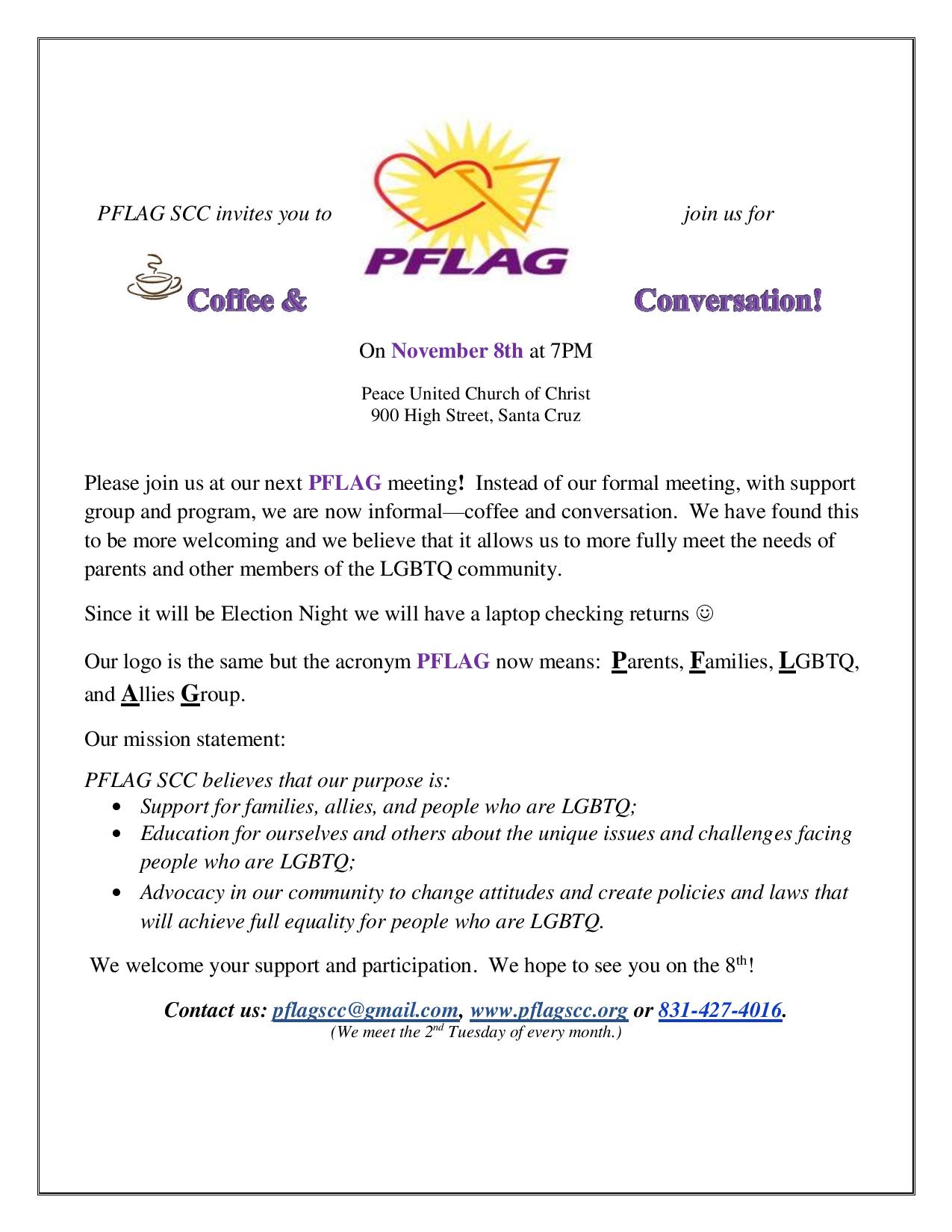 Contact PFLAG: pflagscc@gmail.com, www.pflagscc.org or 831-427- 4016.