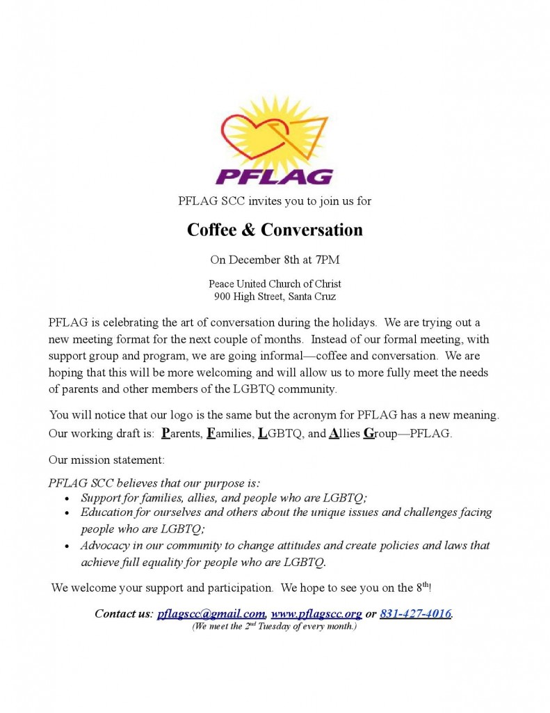 PFLAG is celebrating the art of conversation during the holidays. We are trying out a new meeting format for the next couple of months. Instead of our formal meeting, with support group and program, we are going informal—coffee and conversation. We are hoping that this will be more welcoming and will allow us to more fully meet the needs of parents and other members of the LGBTQ community.