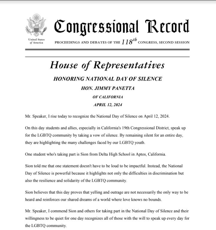 Congressmember Jimmy Panetta speaks out on floor of Congress in support of 2024 Day of Silence. The full video is available here.