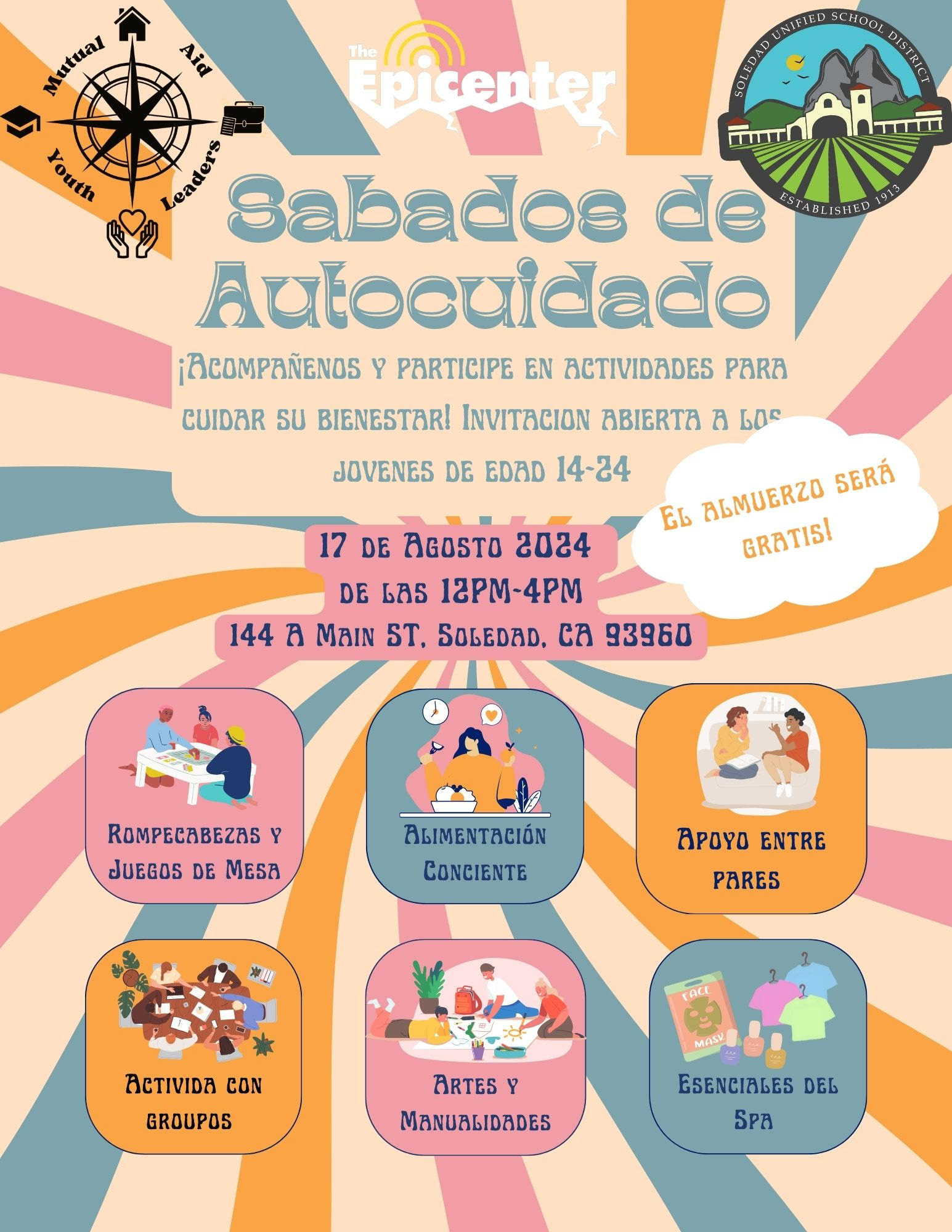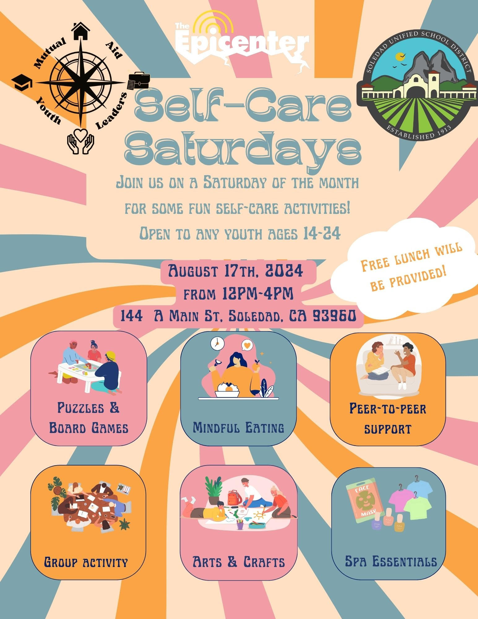 Self-Care Saturdays, August 17, Soledad August 7, 2024 Join us on a Saturday of the month for some fun self-care activities! Open to any youth ages 14 – 24 Next Meeting: Saturday, August 17th, 2024 @ 12 – 4 PM