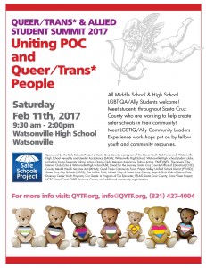 Sponsored by the Safe Schools Project of Santa Cruz County, a program of the Queer Youth Task Force, Watsonville High School Sexuality & Gender Acceptance (SAGA) student club and additional community organization’s.